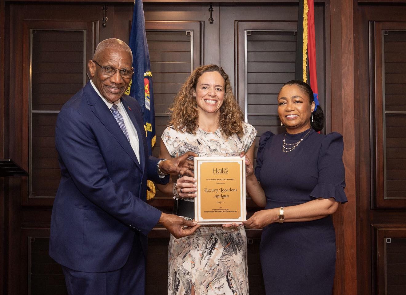 Nadia Dyson of Luxury Locations is this year‘s recipient of the Halo Corporate Citizens Award. For many years, Luxury Locations has been assisting Halo in executing some of its projects, including the donation of Christmas gifts for distribution to the needy. Their Excellencies Sir Rodney and Lady Sandra Williams handed over the award to Nadia this morning at Government House.